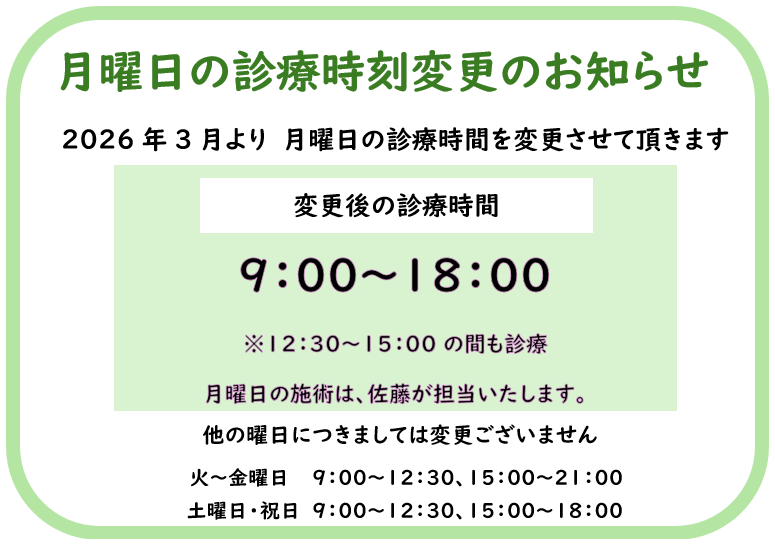 現在、月曜日も診療しておりますので、是非ご利用ください