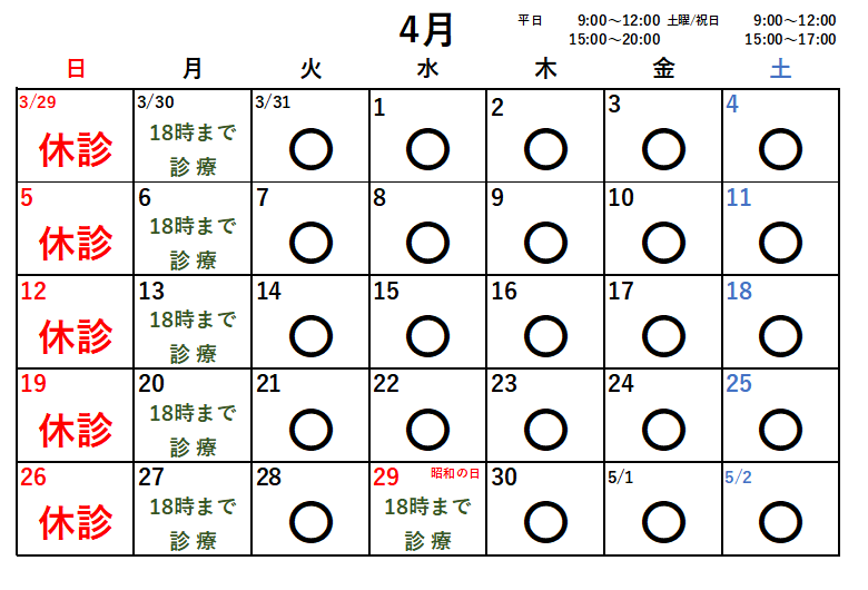 | 9:00〜 12:30 | ○ | ○ | ○ | ○ | ○ | ○ | × |
